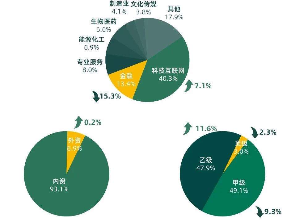 科技互聯(lián)網(wǎng)、金融、專業(yè)服務(wù)行業(yè)仍是市場(chǎng)成交的主要來源,金融行業(yè)成交面積占比下降明顯,降低15.3個(gè)百分點(diǎn),科技互聯(lián)網(wǎng)行業(yè)成交面積占比上升顯著,環(huán)比上升 7.1個(gè)百分點(diǎn) 。