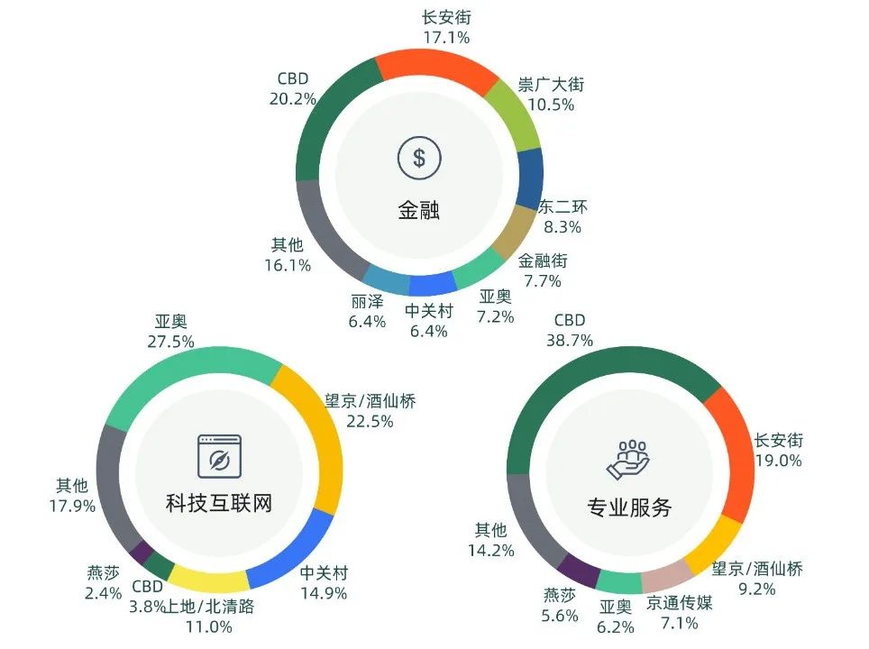 金融行業(yè)在CBD 、長(zhǎng)安街、崇廣大街和東二環(huán)商圈均有落位,本季度金融行業(yè)在長(zhǎng)安街商圈成交面積占比明顯增加。 CBD 及長(zhǎng)安街商圈良好的樓宇品質(zhì)吸引了本季度五成的專業(yè)服務(wù)類企業(yè)進(jìn)駐 。