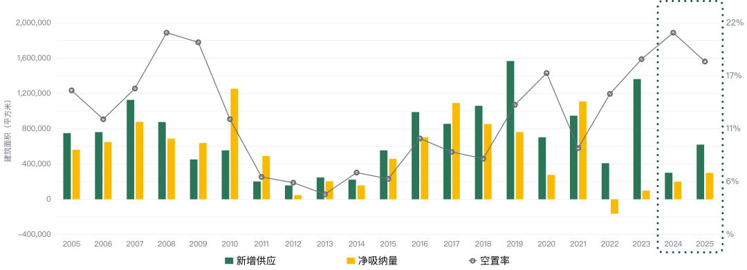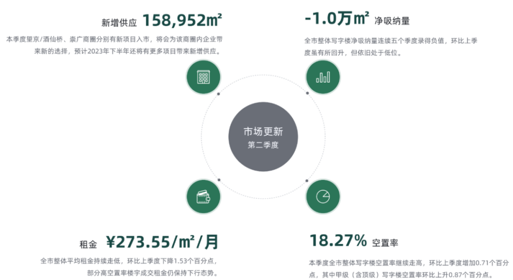 2023年第二季度受整體市場(chǎng)受整體市場(chǎng)壓力及租金下行影響,凈吸納量雖有所回升,但仍錄得負(fù)值。空置率也因新項(xiàng)目入市及部分企業(yè)退租、縮減面積而繼續(xù)呈上行態(tài)勢(shì)。