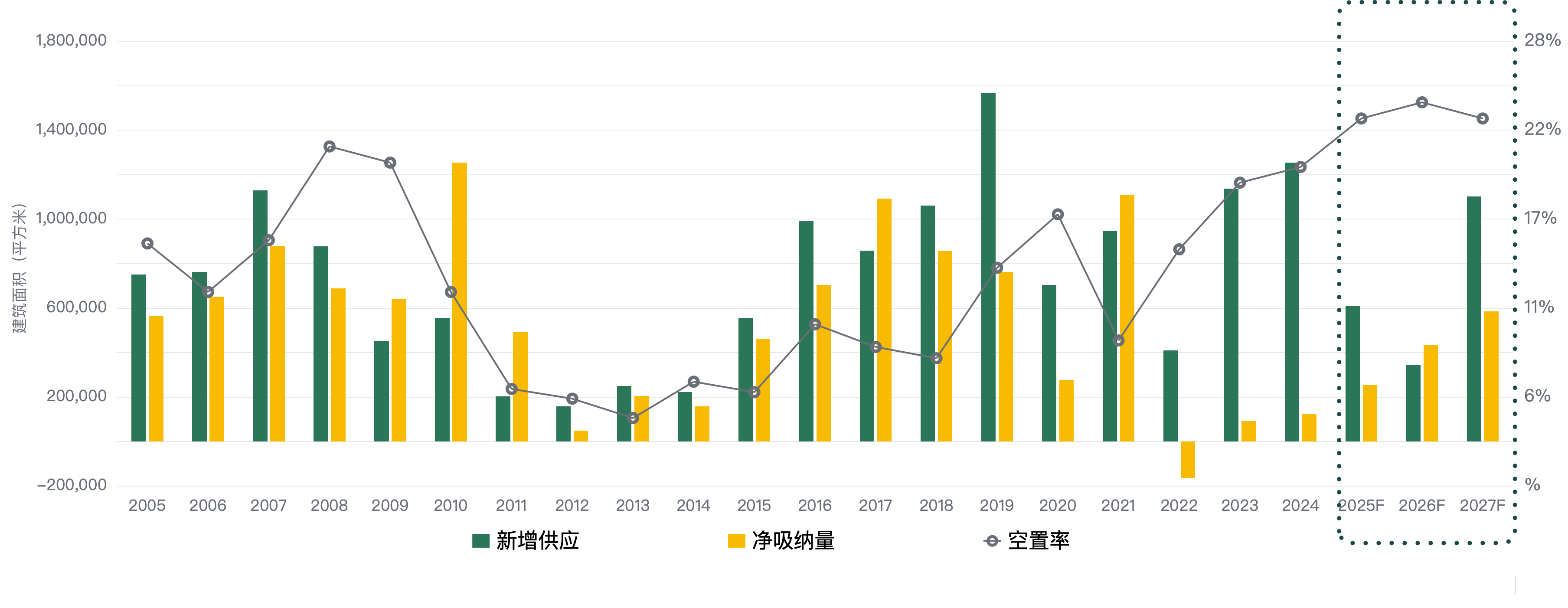 2024年全年投入市場的新增供應量超過了120萬平方米,其中甲級寫字樓超過30萬平方米;部分開發商保持觀望態勢,將原計劃于年內入市的新項目延后至2025年交付。