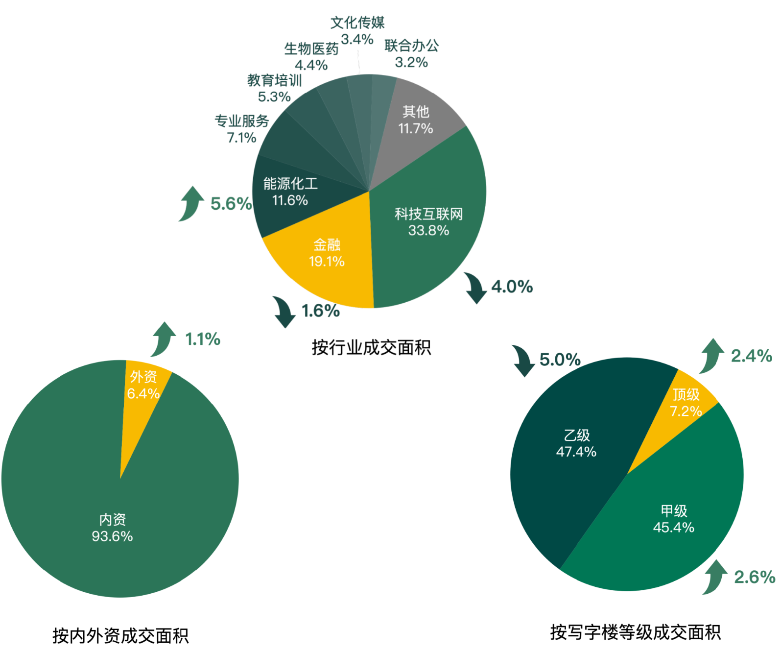 從行業成交面積來看,科技互聯網、金融仍是市場成交的主力行業,本季度科技互聯網行業成交面積占比較上季度降幅顯著,降低4個百分點;金融行業成交面積占比較上季度有所減少,環比降低1.6個百分點;能源化工行業成交面積占比連續三個季度位列第三,環比上升5.6個百分點。