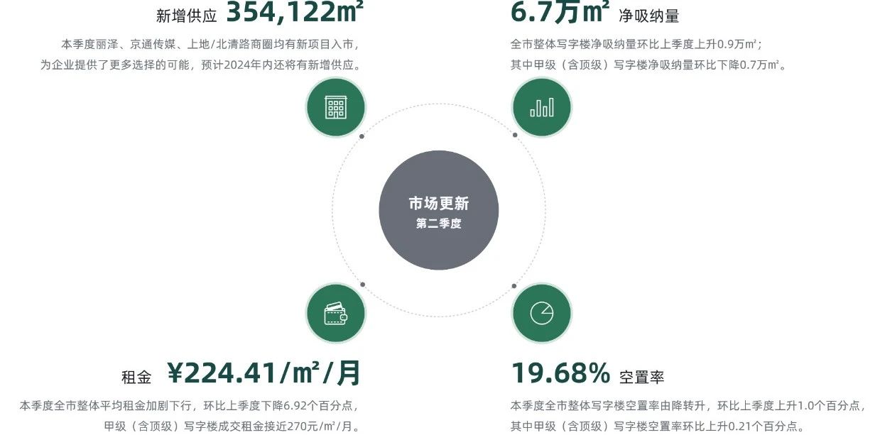 2024年第二季度全市整體寫字樓空置率由降轉升,環比上季度上升1.0個百分點,為19.68%。全市整體寫字樓成交租金環比降低6.92個百分點,錄得每平方米每月224.41元,平均租金收窄態勢仍在加劇。