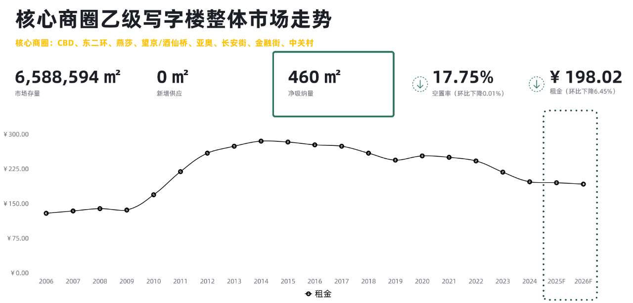 本季度核心商圈整體乙級寫字樓凈吸納量為460平方米。乙級寫字樓的空置率環比上季度下降0.01個百分點,錄得17.75%;成交租金下行趨勢加劇,環比上季度下降6.45個百分點,跌至每平方米每月198.02元。其中長安街、CBD商圈的成交租金降幅明顯,環比降幅在9.0個百分點及以上。